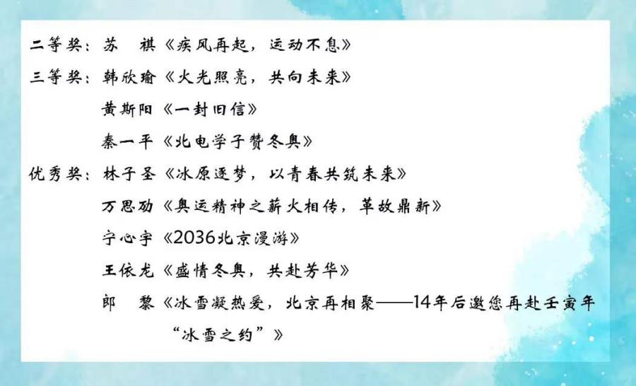 百年风华正青春,决胜冬奥共成长。近期,由共青团中央社会联络部、共青团北京市委员会、北京冬奥组委新闻宣传部联合主办的“青力冬奥·聚力青春”主题征文活动评选结果揭晓。电科院9名同学的作品从全国各高校推荐参赛的6000余篇作品中脱颖而出,获得二等奖1项、三等奖3项、优秀奖5项。电科院获奖数量位居全国高校前列,被评为“优秀组织单位”。