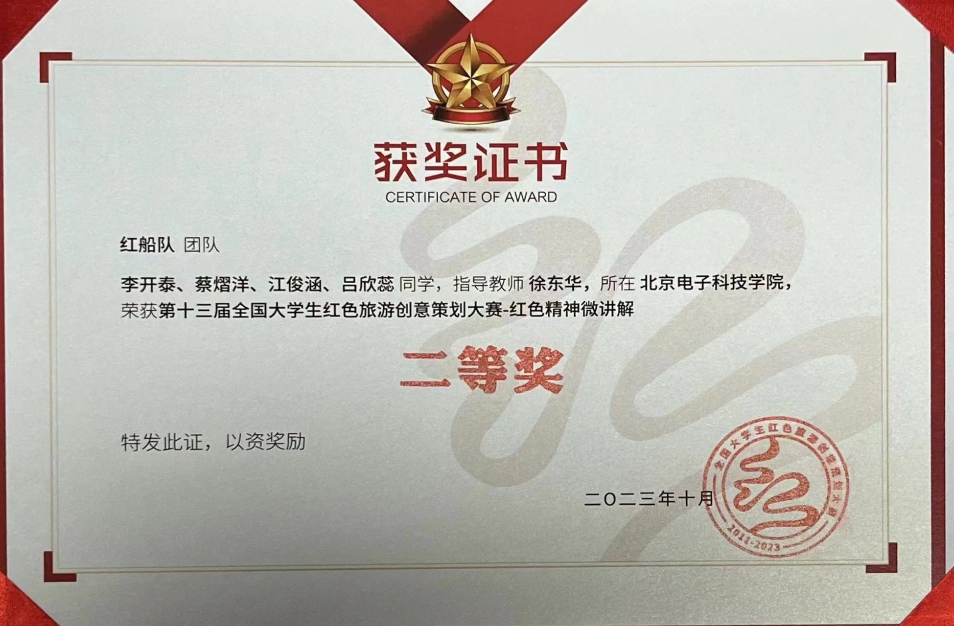 近期,由文化和旅游部主办的第十三届全国大学生红色旅游创意策划大赛决赛落下帷幕,电科院学生团队“红船队”(团队成员:李开泰、蔡熠洋、江俊涵、吕欣蕊)荣获“红色精神微讲解”赛道全国二等奖,指导教师(管理系徐东华)荣获“最佳指导教师奖”,首次代表学院参赛即获得全国奖项,取得突破性成绩。