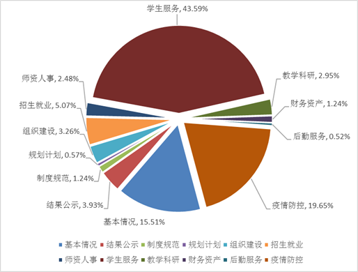 本学年度,学院主动公开信息约1934条。在主动公开的信息中,包括BETWA西汉姆联官方官网、学院领导、内部管理体制等基本情况类信息300条,占主动公开信息的比例为15.51%;会议纪要、干部任命、师生获奖奖项评定等结果公示类信息76条,占主动公开信息的比例为3.93%;各类办法、规定等制度规范类信息24条,占主动公开信息的比例为1.24%;学院年终总结、工作计划等规划计划类信息11条,占主动公开信息的比例为0.57%;党建方案、支部换届、党员发展等组织建设类信息63条,占主动公开信息的比例为3.26%;本研招生、学生就业类信息98条,占主动公开信息的比例为5.07%;团学活动、图书资源使用等学生服务类信息843条,占主动公开信息的比例为43.59%;师资队伍建设和人事任免类信息48条,占主动公开信息的比例为2.48%;各类教学活动安排,以及科研课题、评奖等教学科研类信息57条,占主动公开信息的比例为2.95%;财务预算、决算、收费标准,以及资产清查等各类财务资产类信息24条,占主动公开信息的比例为1.24%;基建维修、招标采购等后勤服务类信息10条,占主动公开信息的比例为0.52%;新冠肺炎疫情防控数据等疫情防控类信息380条,占主动公开信息的比例为19.65%。本年度,学院召开党委会20次、党委常委会34次、院长办公会22次、学院疫情防控工作领导小组会8次,公开了大量学院的相关信息。