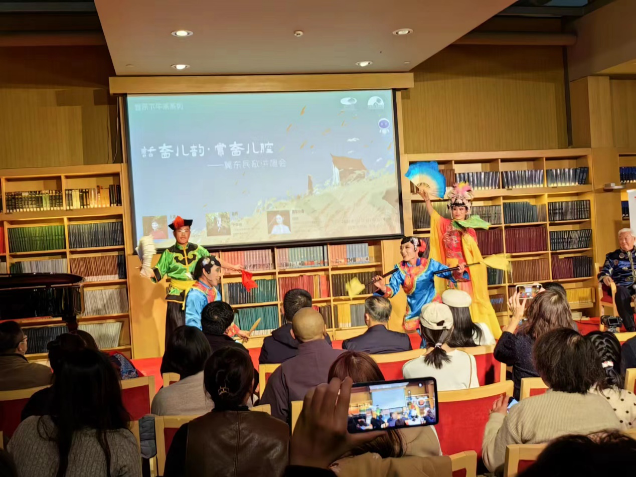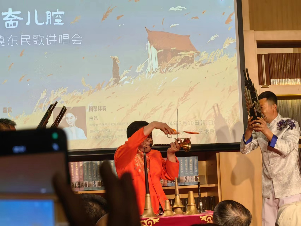 本次讲座由中国音乐学院博士生导师张天彤教授主讲,河北省级非遗项目“冀东民歌”省级代表性传承人89岁高龄的刘荣德先生应邀一同讲述了冀东民歌的内涵、题材、体裁和采集挖掘背后的故事,唐山市古韵新声艺术团现场表演展示冀东民歌的风采。