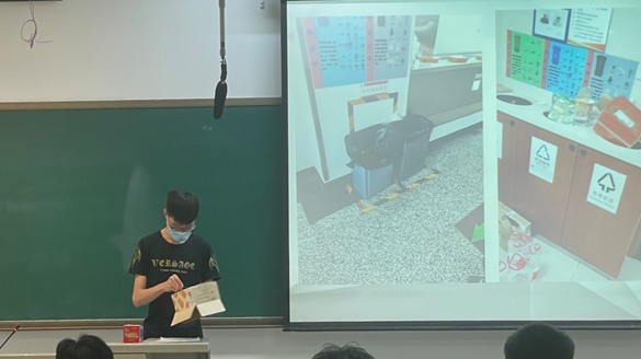 蔡袁新洋同学从抗疫与生态方面开始讲起。沙尘暴席卷北京,使我意识到生态的重要性。我们都知道在我国抗疫期间建了火神山雷神山医院,向世界展现了中国速度,但是你们可能没有关注过施工过程中的扬尘问题。工地上的大型机械运作时往往会有很大的扬尘,而且此时使用除尘车除尘会在一定程度上影响机械运作。所以从这个角度来看,抗疫对生态确实产生了不利影响,而垃圾分类问题也十分严重,在学校经常能看到垃圾桶爆满现象。于是蔡袁新洋亲手示范,将快递箱拆开,他还是能放进去的,而且拆一下也不费时间。如果每个人都把快递箱拆开,垃圾桶的空间利用率也会提高,也不至于出现垃圾堆积在地上的情况。垃圾分类是我们每个人自己的责任。