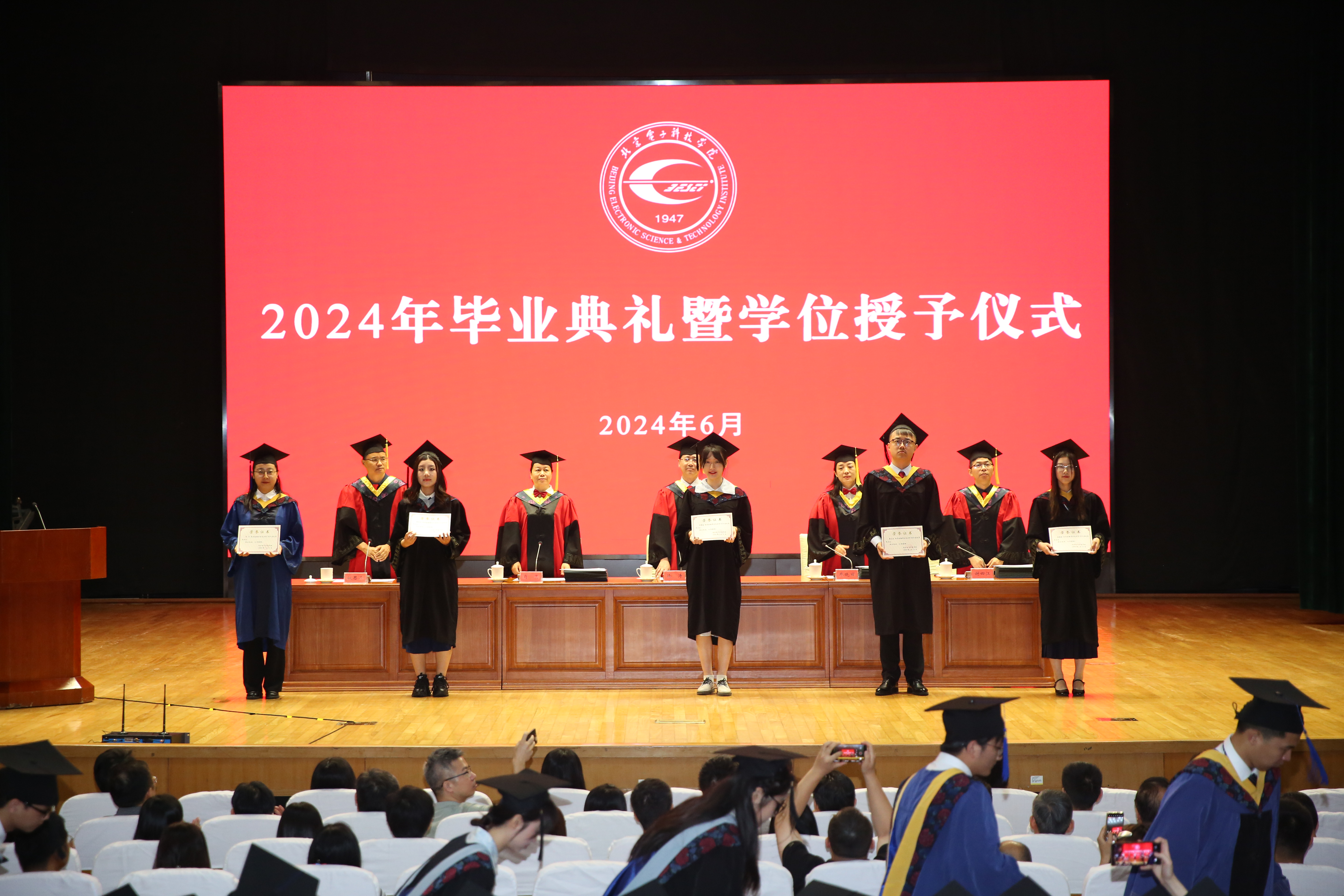 6月20日,电科院2024年毕业典礼暨学位授予仪式在文化艺术中心隆重举行,院领导,各部门主要负责同志,各系部党、团总支书记、学生辅导员,各系团总支书记,毕业班班主任,全体毕业生,部分毕业生家长以及教师代表共约800人参加。